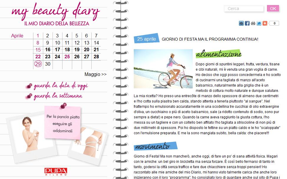 In attesa di essere colpita da una saetta vi invito ad andare a sbirciare la sezione del sito Pupa dedicata ad un vero e proprio programma di mis en forme: My Beauty Diary. All’inizio ero un po’ scettica, ma leggendo giorno dopo giorno i vari articoli ho iniziato ad appassionarmi ed a trovare l’idea tanto utile e divertente da farla diventare un vero e proprio appuntamento quotidiano. La vita a volte si fa così frenetica che dimentichiamo di pensare a quelle piccole cose che ci fanno stare bene: My Beauty Diary è un bel promemoria per non dimenticare di trovare sempre un po’ di tempo per noi stesse e per ricordare quegli accorgimenti talvolta anche banali (un esempio? Bere sempre molta acqua!), ma che finiamo colpevolmente per ignorare.